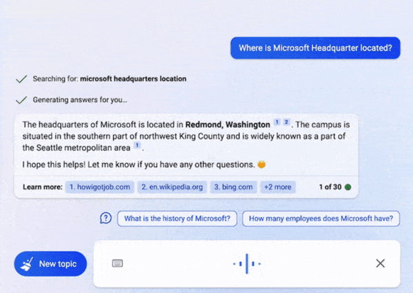 בכניסה ל-“Bing Chat” ניתן יהיה ללחוץ על סימן המיקרופון שמופיע בצידי תיבת הטקסט. בלחיצה על הכפתור, בינג יתחיל בהקלטה ויכתוב את מה שהוא שומע מאיתנו על המסך. כשנסיים לדבר, ההודעה תישלח אוטומטית אל הצ’אט והחיפוש ברשת לתשובות מתאימות יתחיל. בינג ייצור תשובה מותאמת אישית בהתאם לשאלה ששאלנו, ואנחנו נוכל ללחוץ על סימן נוסף שיאפשר לו לקרוא את ההודעה – כך על פי דברי מייקרוסופט: